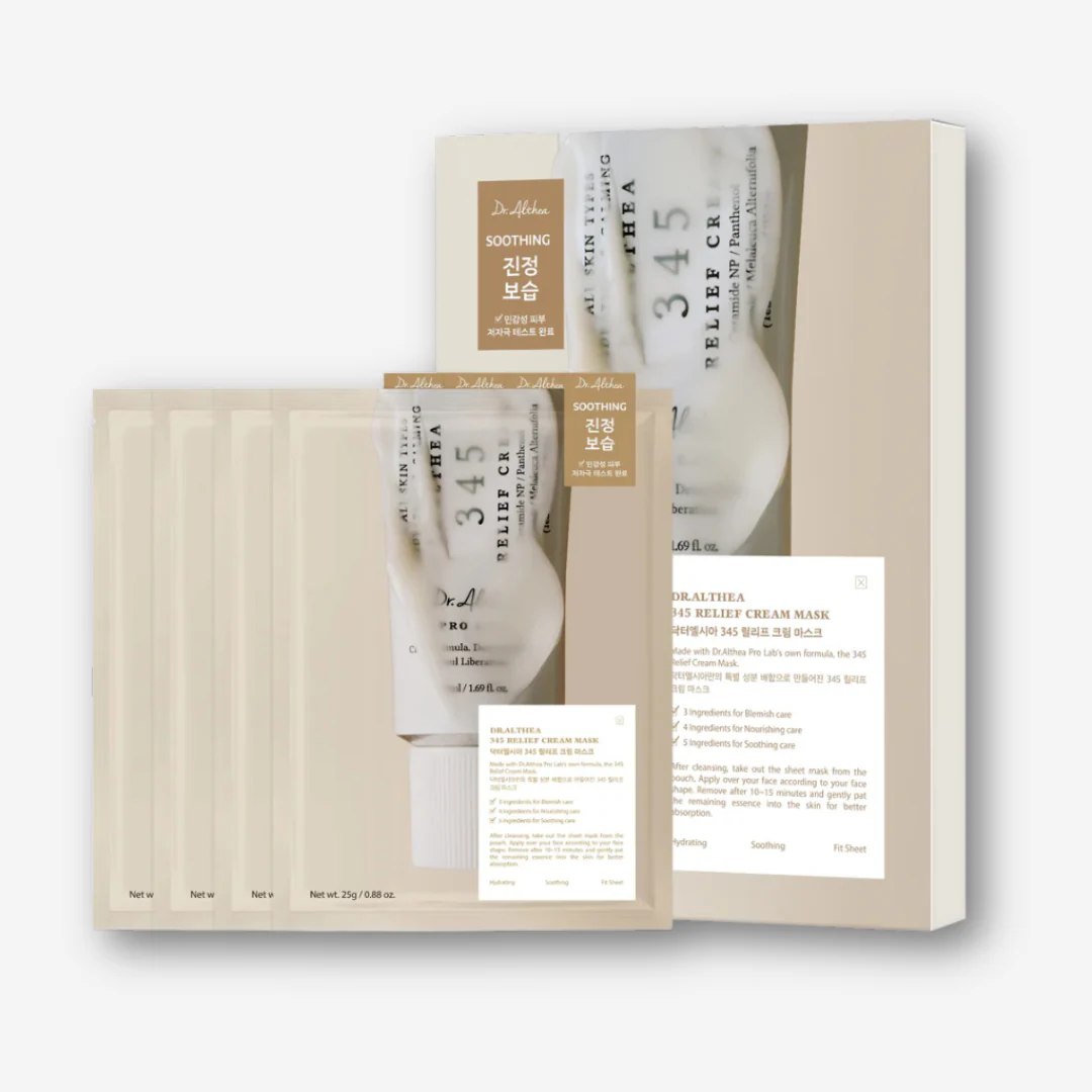 La Dr. Althea 345 Relief Cream Mask es una mascarilla facial coreana en hoja (sheet mask) diseñada para calmar, hidratar y reparar la piel sensible o irritada.